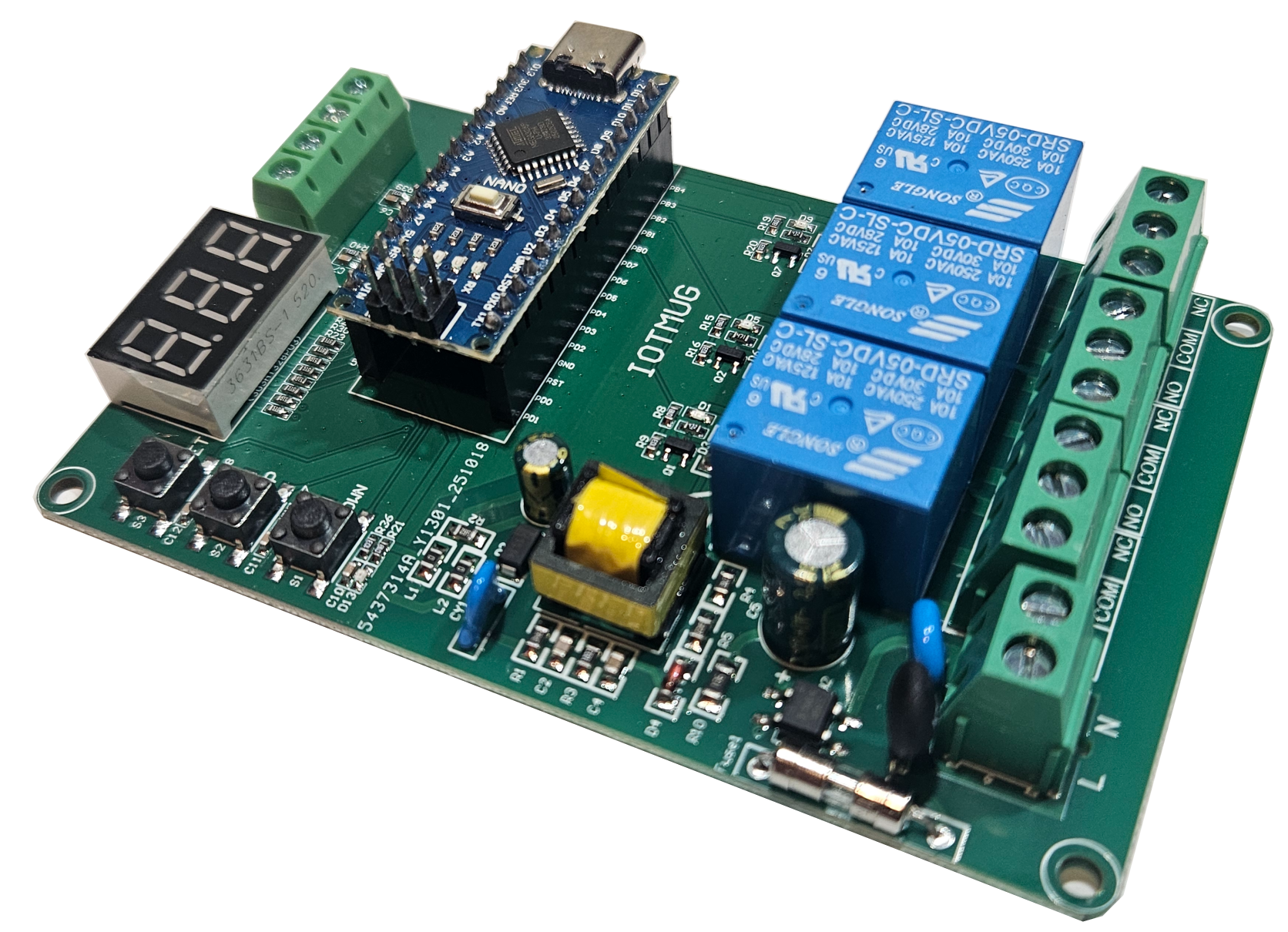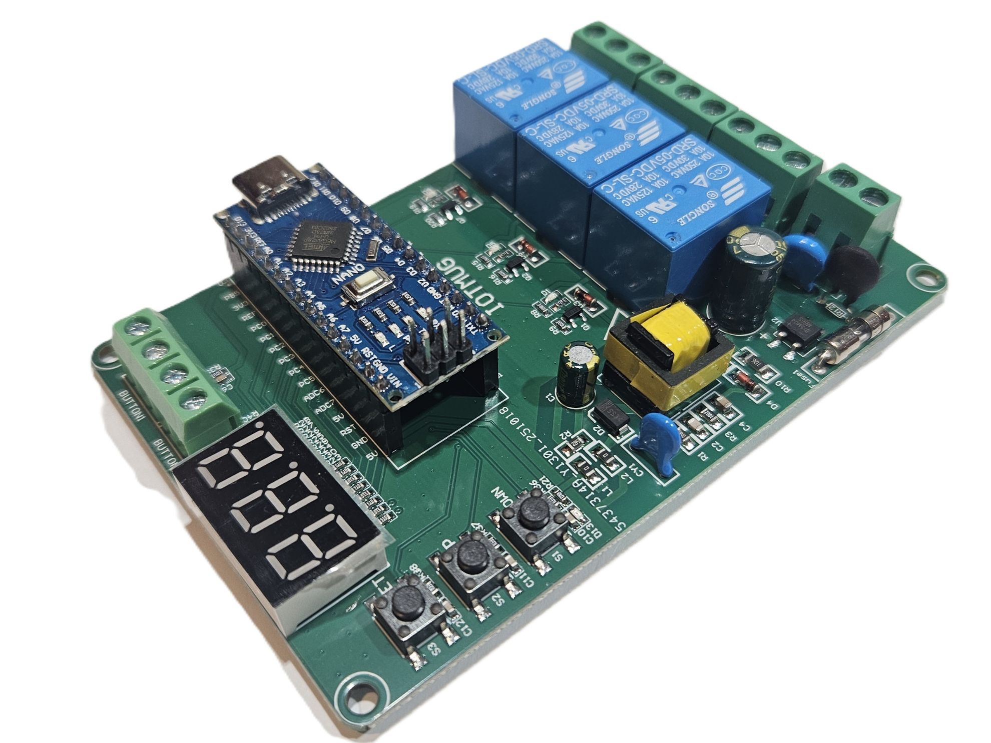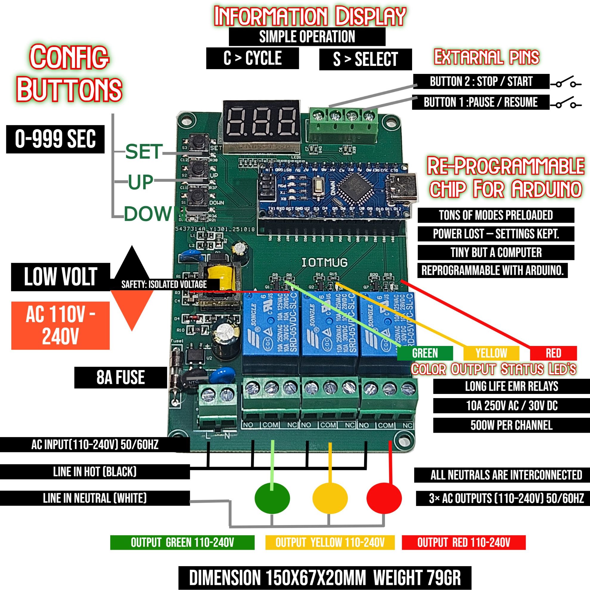 A compact, Arduino-based controller board for running 3-lamp traffic signal sequences and flasher patterns on AC-powered lights. Choose from 99 built-in modes, set timing from the on-board display and buttons, and keep your settings saved even after power loss.