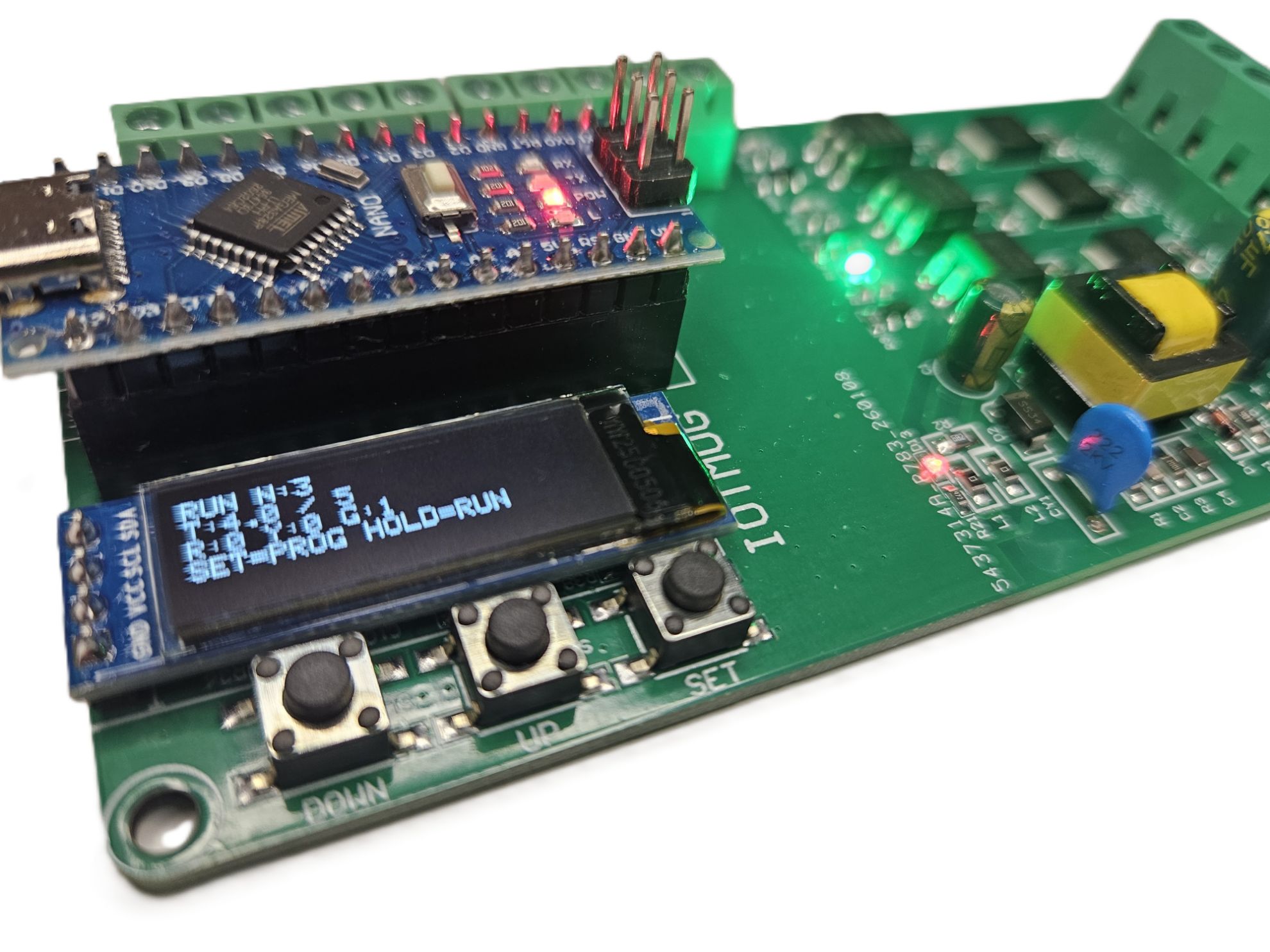 2. OLED DISPLAY FOR QUICK SETUP – Program directly on the board using the onboard OLED screen and SET / UP / DOWN buttons, making everyday adjustments simple without needing a computer.