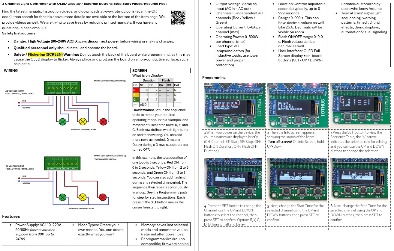 The IOTMUG 3-Channel Programmable AC Light Sequencer Board is a compact solution for custom light sequencing, timed displays, and automation builds. Using the onboard OLED display and buttons, you can create your own sequence table, select each channel, define start and stop times, and add flash ON/OFF behavior for more dynamic output patterns.