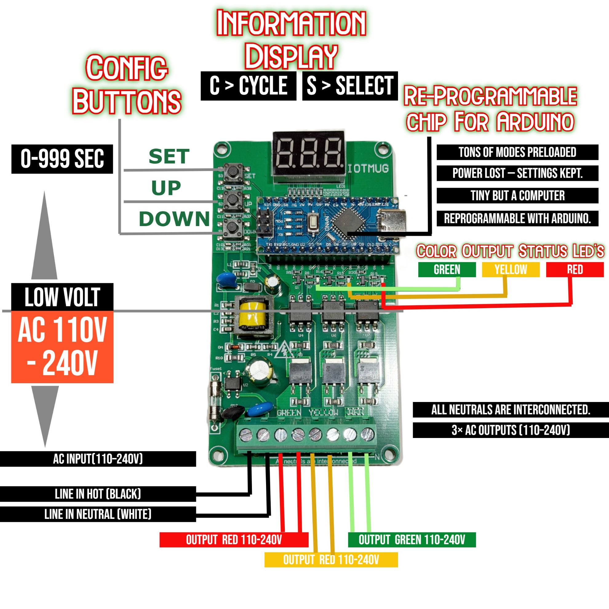 Product Description: User familiarity with basic programming language is essential for optimal use. 3CH Traffic Light Controller, Arduino-Based: Our programmable Traffic Light Controller is the ultimate solution for your traffic signal requirements. It accepts standard 110VAC and 240VAC line voltage, delivering 500 Watts per channel. It's compatible with full-sized LED and incandescent traffic lights, including household incandescent and LED bulbs. The board incorporates the latest solid-state relays technology, ensuring quiet and efficient switching for years to come.