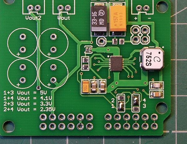 Output voltage level is selected on the two solder jumpers, where the following combination is used:
