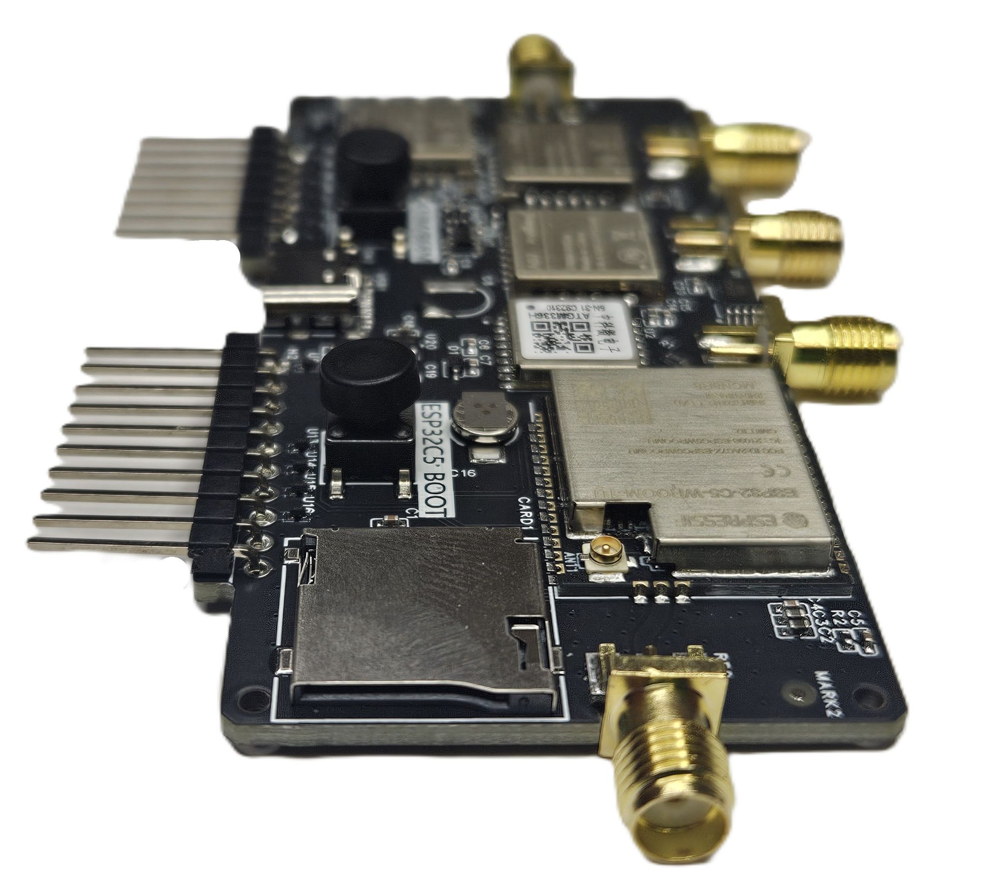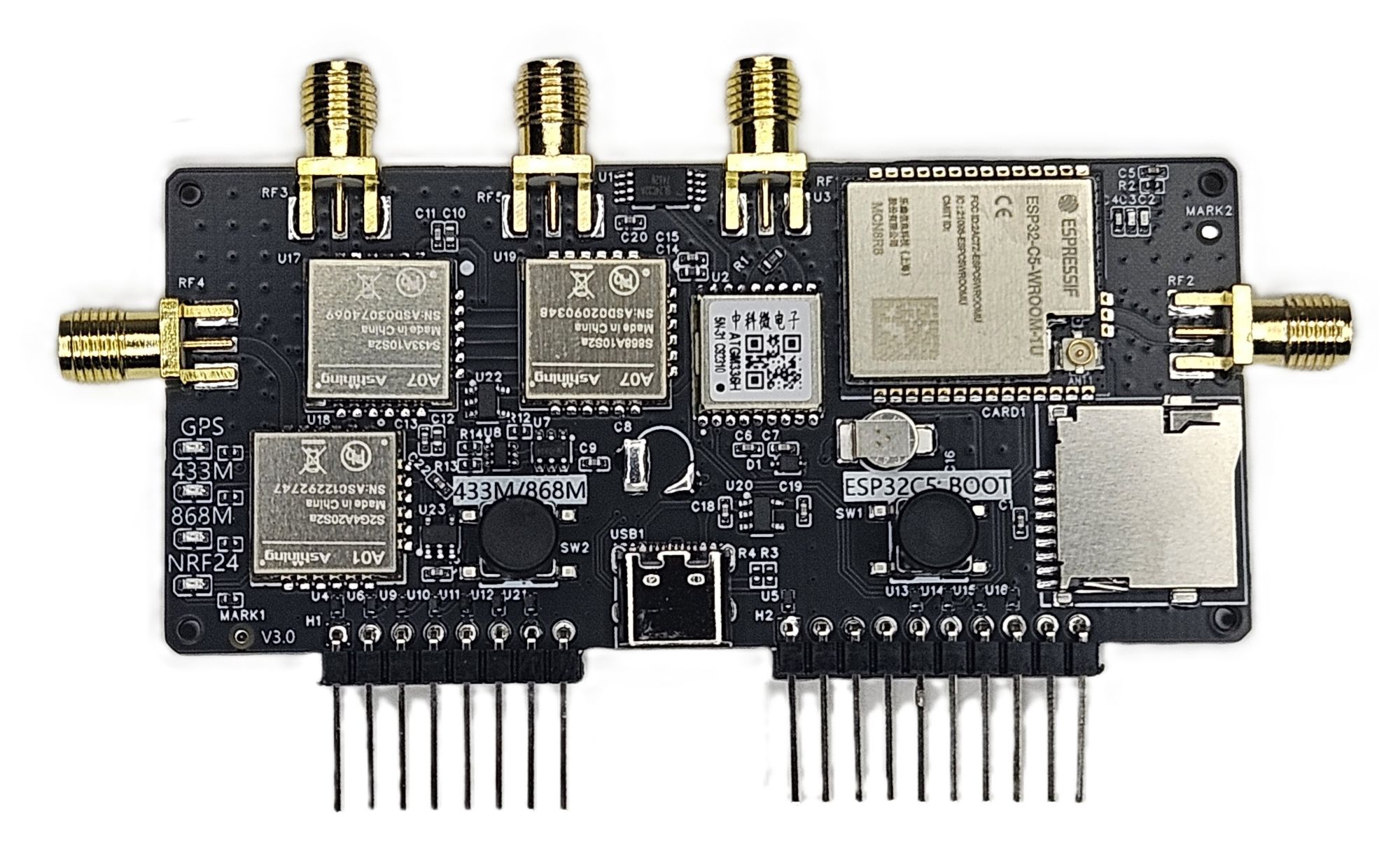 The ESP32-C5 module supports SD card expansion for added flexibility, while the dual-frequency CC1101 design allows quick switching between 433MHz and 868MHz using a single button. LED indicators help identify active functions, and the built-in GPS positioning module adds location capability in a compact format.